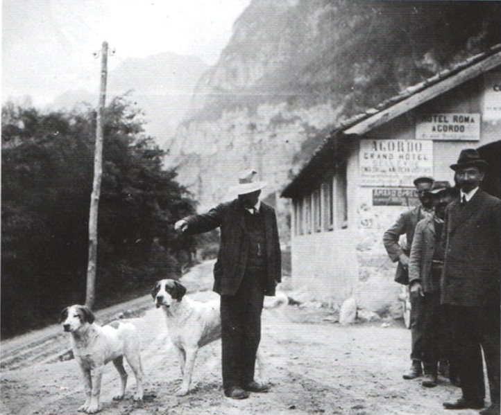 6) Carlo Zanella all'esterno dell'albergo a La Stanga (accanto ai cani) subito dopo la prima guerra mondiale, di Agordo dove era propietario dell'albergo Roma..jpg