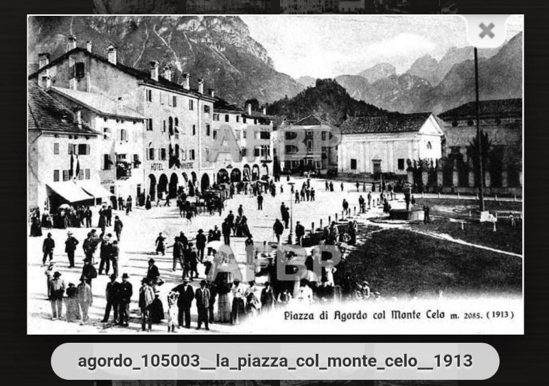 139) Agordo - La piazza col monte Celo m. 2085, anno 1913..jpg